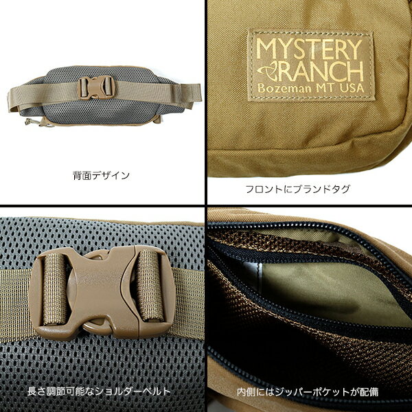 ITEM SPEC Brand MYSTERY RANCH(ミステリーランチ) Item Name FORAGER HIPSACK (フォーリッジャーヒップサック) Color ・BLACK ・COYOTE ・FOLIAGE ・OLIVE Size サイズ計測方法は SIZE CHARTを ご確認ください ONE SIZE W26cm/H13cm/D5cm 重量: 0.15kg 容量 1.5L Featured 内側にジッパーポケット 蒸れずらい背面のメッシュ 必要最小限の荷物の持ち運びに 日本限定モデル MADE IN U.S.A. Notice ▼長時間濡れたままで重ねて置いたり、摩擦(特に湿った状態での摩擦)や、汗や雨などでぬれた時は他の衣料等に移染する場合がございますのでお気を付け下さいませ。